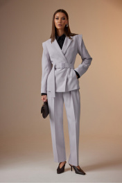 Комплект женский трехпредметный: жакет, топ, брюки. Жакет: полуприлегающего силуэта с двухбортной застежкой на одну пуговицу. Воротник пиджачного типа. Рукав длинный, трехшовный – дополнительный шов по центру верхней половинки для создания объема рукава, так же в швы верхних половин рукава вставлено крылышко для расширения линии плеча. По переду отрезной бочок, от него нагрудная вытачка и карманы в шве. Спинка со средним швом, отрезным бочком и талиевыми вытачками. Блуза: прямого силуэта, покроя спущенное плечо, с центрально-бортовой застежкой. Горловина оформлена стояче-отложным воротником с отрезной стойкой. Рукав полной длины с широкими манжетами по низу. Брюки: типа «бананы». На передних и задних половинках заутюжены стрелки. На передней половинке боковой карман и две складки, направленные к центру. На задней правой половинке выполнен прорезной карман с листочкой. Верхний срез брюк обработан поясом со шлевками. К жакету прилагается пояс с отделочной пряжкой Фурнитура может отличаться от фото, не изменяя художественному образу. Жакет: Ширина изделия на уровне глубины: 42р – 45см, 44р – 47см, 46р – 49см, 48р – 51см, 50р – 53см, 52р – 55см; Ширина по линии талии: 42р – 37см, 44р – 39см, 46р – 41см, 48р – 43см, 50р – 45см, 52р – 47см; Ширина по линии бедер: 42р -48см, 44р – 50см, 46р – 52см, 48р – 54см, 50р – 56см, 52р – 58см; Длина по среднему шву спинки: 42р – 67см, 44р – 67см, 46р – 67см, 48р – 68см, 50р – 68см, 52р – 68см; Ширина спинки: 42-46р – 17см, 48-52р – 19см; Ширина плеча: 42-46р – 11см, 48-52р – 12см; Ширина рукава под проймой: 42р – 19см, 44р – 20см, 46р – 21см, 48р – 21см, 50р – 22см, 52р – 23см; Длина рукава: 63 см. Блуза: Ширина изделия на уровне глубины: 42р – 47см, 46р – 49см, 46р – 51см, 48р – 53см, 50р – 55см, 52р – 57см; Ширина по линии бедер: 42р – 49см, 44р – 51см, 46р – 53см, 48 – 55см, 50р – 57см, 52 – 59см; Длина по среднему шву спинки: 42-46р – 62см, 48-52р – 65см; Ширина плеча: 42р – 17см, 44р – 18см, 46р – 19см, 48 – 20см, 50р – 21см, 52 – 22см; Ширина рукава под проймой: 42-46р – 22см, 48-52р – 24см; Длина рукава: 73см. Брюки: Ширина по линии талии: 42р – 33см, 44р – 35см, 46р – 37см, 48р – 39см, 50 – 41см, 52р – 43см; Ширина по линии бедер: 42р – 46см, 44р – 48см, 46р – 50см, 48р – 52см, 50 – 54см, 52р – 56см; Длина по боковому шву без пояса: 42-46р – 102см, 48-52р – 103см; Ширина брючины внизу: 42р – 20см, 44р – 21см, 46р – 22см, 48р – 22см, 50 – 23см, 52р – 24см; Высота посадки: 42-46р – 31см, 48-52р – 32см; Длина по внутреннему шву: 42-46р – 80см, 48-52 – 79см.