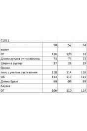 Комплект женский: жакет, блузка, брюки. Жакет со спущенным рукавом, центральной застежкой на магниты и воротником стойкой. На переде обработаны накладные карманы с клапанами. По спинке отрезная кокетка. По низу кулиска по талии. Длинный рукав, на резинке. Брюки заужены к низу с карманами в боковых швах. Верхний срез брюк на поясе частично на резинке. Блузка с округлым вырезом горловины, коротким рукавом и термоапликацией по переду. Длина жакета 60см, длина от проймы 73см, длина брюк 99см.