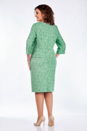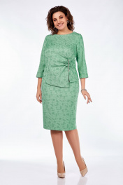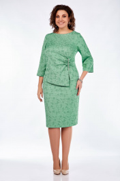 Нарядный комплект состоит из блузы и юбки. Блуза полуприлегающего силуэта, с нагрудными вытачками, в области талии слева сборка и декор, центральная часть полочки удлинена с разрезом. По спинке талиевые вытачки и средний шов с потайной молнией. Рукав трехчетвертной, прямой. Юбка на подкладке, на поясе с резинкой по бокам, в среднем шве спинки молния и шлица. Длина блузы 50см, длина рукава 47см, юбка длина 68см.