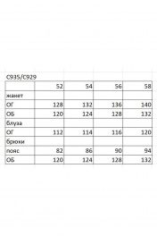 Стильный комплект. Жакет прямого силуэта, воротник с лацканали, застежка на две пуговицы, в боковых швах имитация шлиц с двумя пуговицами. Рукав спущенного кроя, три-четверти с патой на 1 пуговицу. Брюки свободного кроя на резинке, карманы в боковых швах, по низу имитации шлиц и две пуговицы. Блуза однотон, линия плеча спущена. Длина жакета 67см, длина рукава 40см, длина блузки 62см, длина брюк 109см