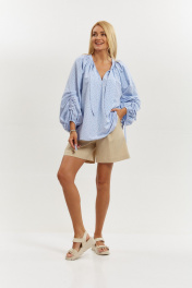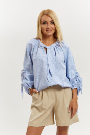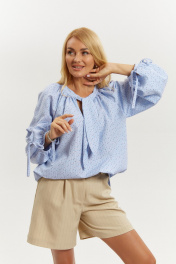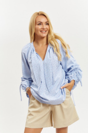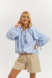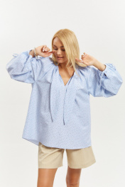 Блузка из хлопковой ткани свободного силуэта. Рукав реглан, длинный, широкий, длина регулируется интересной кулиской с завязками, низ обработан бейкой. Горловина блузки обработана широкой бейкой, переходящей в декоративные детали, которые можно завязать. В верхней части по пореду заложена сборка. Низ блузки фигурной формы. Длина блузки 70см