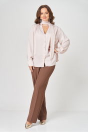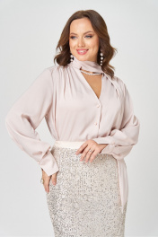Блузка выполнена из мягкой струящейся ткани с матовым блеском. Стойка и V-образный вырез горловины. Блузка прямого силуэта, с отрезными кокетками на полочке, от которых заложена сборка, застежка на пуговицы. Разрезы по боковым швам. Рукав одношовный, с манжетой фигурной формы. Сьемное украшение выполнено из бусин, сьемное. В комплекте галстук-пояс. Длина блузки 63.5см, длина рукава 63см С961 52 54 56 ОГ 114 118 122 ОБ 118 122 126 Обхват рукава 42 44 46