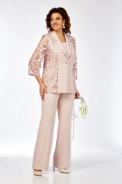 Комплект женский, нарядный, состоящий из жакета, брюк и блузки. Стильный жакет полуприлегающего силуэта с пиджачным воротником, с застежкой на одну пуговицу. Жакет выполнен из сочетания двух тканей- кружево и однотон. Спинка со средним швом. Рукав из кружевной ткани, длиной три четверти. Блузка без рукавов, с округлым вырезом горловины. По переду нагрудные вытачки. Брюки прямые, со стрелками, на поясе. По спинке пояс на резинке. Длина жакета 69см, длина рукава 48см, длина брюк 112см 48 50 52 54 56 58 ОГ 102 106 110 112 116 120 ОТ 96 100 104 108 112 116 ОБ 114 118 122 124 128 132 Ширина рук.вверху 17,5 18,5 19,5 20,5 21,5 22,5 Дл.рукава 51 51 51 51 51 51 Дл.платья 106 106 106 111 111 111