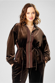 Костюм повседневный из бархатного полотна, состоящий из джемпера и брюк. Джемпер полностью на молнии по переду, вдоль молнии отделочная планка. Воротник-стойка. Вдоль бокового шва планка из отделочной ткани. Карманы в боковых швах. В области талии кулиска, в которую продет шнур из основной ткани. Рукав одношовный с притачной манжетой. Брюки заужены к низу, на поясе. Пояс на резинке, слева завязка из отделочной ткани. Карманы в боковых швах. Длина жакета 70см, длина рукава 48см, длина брюк 103см