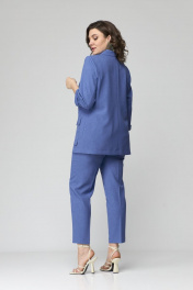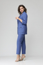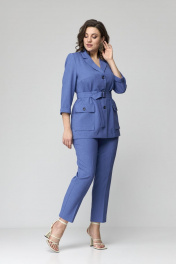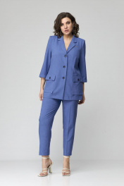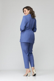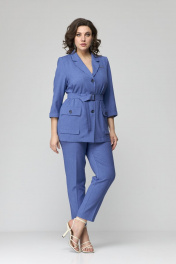 Комплект полуприлегающего силуэта, втачного покроя с центрально-бортовой застежкой на петли-пуговицы. Выполнен из однотонной ткани костюмно-плательного ассортимента. В жакете спинка со средним швом. На переде расположены нагрудные вытачки, идущие из бокового шва. На деталях переда расположены горизонтальные кокетки. В шов притачивания левой кокетки вставлена листочка, на которой находится нашивка. Горловина оформлена воротником пиджачного типа. Рукав ¾ с притачной манжетой. В области бедер, на переде, расположены накладные карманы со складкой в нижней части и клапаном, фиксирующимся на петлю-пуговицу. К жакету прилагается пояс из основной ткани, на пряжку. Брюки классической формы, заужены к низу. На передних и задних половинках заутюжены стрелки. Верхний срез брюк обработан поясом с резинкой от карманов и по спинке. В боковых швах расположены наклонные карманы. Жакет: Ширина изделия по груди: 50р – 55см, 52р – 57см, 54р – 59см Ширина по линии талии: 50р – 52см, 54р – 54см, 54р – 56см Ширина по линии бедер: 50р – 58см, 52р – 60см, 54р – 62см Длина по среднему шву спинки: 50р – 71см, 52р – 71см, 54р – 71см Ширина спинки: 50р – 42см, 52р – 42см, 54р – 42см Ширина плеча: 50р – 12,5см, 52р – 12,5см, 54р – 12,5см Ширина рукава под проймой: 50р – 19р, 52р – 20см, 54р – 21см Длина рукава: 50р – 46см, 52р – 46см, 54р – 46см Брюки: Ширина по линии талии (без натяжения резинки): 50р – 39см, 52р – 41см, 54р – 43см Ширина по линии бедер: 50р – 55см, 52р – 57м, 54р – 59см Длина по боковому шву: 50р – 99см, 52р – 99см, 54р – 99см Ширина брючины внизу: 50р – 18см, 52р – 19см, 54р – 20см Высота посадки: 50р – 37см, 52р – 37см, 54р – 37см Длина по внутреннему шву: 50 – 72см, 52р – 72см, 54р – 72см