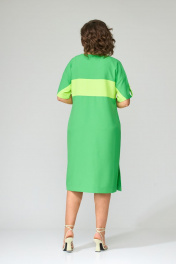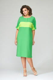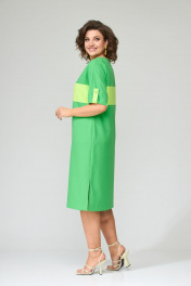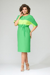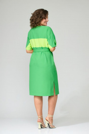 Платье полуприлегающего силуэта, покроя спущенное плечо. Выполнено из плательной группы с хорошими гигроскопическими свойствами. Горловина округлой формы, рукава короткие. Платье резное, выполнено из двух цветов ткани (основной и отделочной). В верхней кокетке переда расположены застежки на петли-пуговицы до горизонтального подреза. Рукава резные, по центру подобраны патой, фиксирующейся на петлю-пуговицу контрастного цвета. На переде и спинке расположена горизонтальная деталь, переходящая на рукав из отделочной ткани. По плечевым швам переда и спинки расположены лампасы, переходящие на рукав из основной ткани. В боковых швах разрезы. Дополнением к платью служит пояс из основной ткани. Ширина изделия по груди: 50р – 55см, 52р – 57см, 54р – 59см Ширина по линии талии: 50р – 52см, 52р – 54см, 54р – 56см Ширина по линии бедер: 50р – 58см, 52р – 60см, 54р – 62см Длина по среднему шву спинки: 50р – 106см, 52р – 106см, 54р – 106см Ширина рукава под проймой: 50р – 24см, 52р – 24см, 54р – 24см Длина рукава от горловины: 50р – 39см, 52р – 39см, 54р – 39см