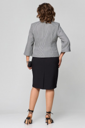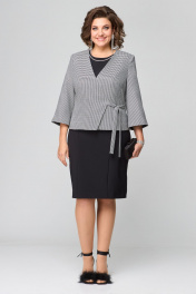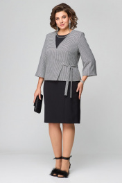 Комплект женский двухпредметный : жакет, платье. Платье Платье женское полуприлегающего силуэта втачного покроя. Выполнено из плательной ткани. Горловина округлой формы с отделкой по переду из нити со стразами. Рукава короткие одношовные. На спинке расположен средний шов в котором шлица и застежка на тесьму-молнию. Платье длиной за калено. Жакет полуприлегающего силуэта втачного покроя с ассиметричной двубортной застежкой на потайную пуговицу и завязки-пояски из борта и бокового шва. Рукава 3\4 расширенные к низу.На спинке расположен вертикальный шов и талевые выточки. Жакет: Ширина изделия на уровне глубины: 50 р-54 см ,52 р-56 см., 54 р- 58 см. Ширина по линии талии: 50 см-54 см , 52 р-56 см , 54 р- 58 см. Ширина по линии бедер: 50 р – 58 см, 52 р – 60 см, 54р – 62 см. Длина : 50-54 р – 56 см Длина рукава : 50- 54 р р -47 см Ширина рукава под пройме : 50 р -18 см, 52 р-19 см, 54 р – 20 см. Платье: Ширина изделия на уровне глубины: 50р – 53,5см, 52р – 55,5см, 54р – 56см. Ширина по линии талии: 50р – 47.5см, 52р – 49.5см, 54р – 51.5см. Ширина по линии бедер: 50р – 55см, 52р – 57см, 54р – 59см. Длина по среднему шву спинки: 50р – 101см, 52р – 101см, 54р – 101см. Ширина спинки: 50р – 37.5см, 52р – 37.5см, 54р – 37.5см. Ширина плеча: 50р – 10.5см., 52р – 10.5см, 54р – 10.5см. Ширина рукава под проймой: 50р – 18см., 52р – 19см, 54р – 20см. Длина рукава: 50р – 28см., 52р – 28см, 54р – 28см.