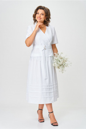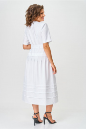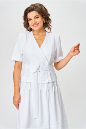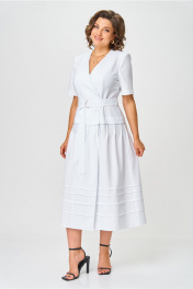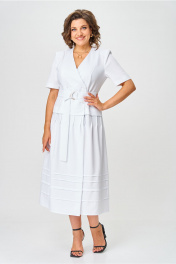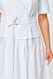 Платье женское полуприлегающего силуэта, с имитацией жакета, с двубортной застежкой на петли-пуговицы. По переду «V-образный» вырез и рельефные линии от плеча. Спинка с двумя рельефами, рядом настрачиваются шлевки, шлевки так же в боковых швах. Юбка в платье с вертикальными защипами сверху и горизонтальными по всей ширине низа платья. Рукав втачной, короткий. К платью прилагается пояс из основной ткани, с полукольцами на конце. Ширина изделия на уровне глубины: р46 – 49см, р48 – 51см, р50 – 53см, р52 – 55см, р54 – 57см, р56 – 59см; Ширина по линии талии: р46 – 43см, р48 – 45см, р50 – 47см, р52 – 49см, р54 – 51см, р56 – 53см; Ширина по линии бедер: р46 – 52см, р48 – 54см, р50 – 56см, р52 – 58см, р54 – 60см, р56 – 62см; Длина по среднему шву спинки: р46-50 – 124см, р52-56 – 125см; Ширина спинки: Ширина плеча: р46-50 – 13см, 52-56 – 14см; Длина рукава: р46-50 – 28см, р52-56 – 30см; Ширина рукава под проймой: р46 – 17,5см, р48 – 18,5см, р50- 19,5см, р52– 20,5см, р54 – 21,5см, р56 – 22,5см.