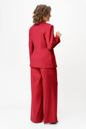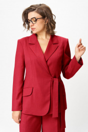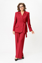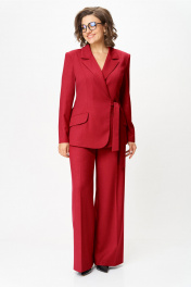 Комплект женский, состоящий из жакета и брюк, выполнен из костюмной ткани. Жакет полуприлегающего силуэта с двубортной застежкой, завязывающейся на пояс. Воротник пиджачного типа. Рукав длинный, двушовный, втачной, плечо слегка расширено. Спинка со средним швом и рельефом из плечевого шва. По переду полурельеф из плеча, заканчивающийся вытачкой, обработаны прорезные карманы с листочкой и клапаном. Низ борта закругленный. Брюки прямые, (широкие внизу) с заутюженными стрелками, с карманами в боковых швах, полукруглой формы. Верхний срез обработан поясом, с резинкой по центру задней части. На задних половинках расположены талиевые вытачки. Застежка брюк на тесьму-молнию. Жакет: Ширина изделия на уровне глубины: 48р – 51см, 50р – 53см, 52р – 55см, 54р – 57см, 56р – 57см, 58р – 59см; Ширина по линии талии: 48р – 44см, 50р – 46см, 52р – 48см, 54р – 50см, 56р – 52см, 58р – 54см; Ширина по линии бедер: 48р – 54см, 50р – 56см, 52р – 58см, 54р – 60см, 56р – 62см, 58р – 64см; Длина по среднему шву спинки: 48-52р – 70см, 54-58р – 72см; Ширина спинки: 48-52р – 41см, 54-58р – 43см; Ширина плеча: 48-52р – 14,5см, 54-58р – 15,5см; Ширина рукава под проймой: 48р – 19см, 50р – 20см, 52р – 21см, 54р – 21см, 56р – 22см, 58р – 23см; Длина рукава: 48-58р – 62см. Брюки: Ширина по линии талии (без натяжения резинки): 48р – 39см, 50р – 41см, 52р – 43см, 54р – 45см, 56р – 47см, 58р – 49см; Ширина по линии бедер: 48р –53см, 50р – 55см, 52р – 57см, 54р – 59см, 56р – 61см, 58р – 63см; Длина по боковому шву с поясом: 48р-58р – 107см; Ширина брючины внизу: 48р –32см, 50р – 33см, 52р – 334см, 54р – 34см, 56р – 35см, 58р – 36см; Высота посадки: 48р-52р – 33см, 54-58р – 34см; Длина по внутреннему шву: 48р-52р – 81см, 54-58р – 80см.