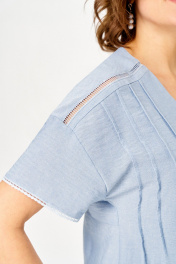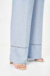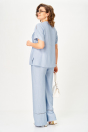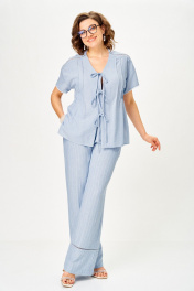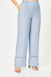 Комплект женский, состоящий из блузы и брюк, выполнен из однотонной ткани в полоску (брюки) из костюмной ткани. Блуза свободного покроя со спущенным плечом, слегка расширенная книзу. Блуза имеет У-образный вырез и застежку в виде завязывающихся шнурков с потайной планкой. Перед с отрезной кокеткой, параллельно которой вставлена отделочная тесьма. От кокетки вниз застрочены защипы, по боковым швам разрезы. Спинка отрезная чуть выше линии талии, нижняя часть слегка расширена. Рукав спущенный, по низу пришита декоративная тесьма. Брюки прямые, свободной формы, по низу отрезные, с декоративной тесьмой. Верхний срез брюк обработан поясом, с резинками по боковым швам и имитацией застежки. В боковых швах выполнены наклонные карманы. Блуза: Ширина изделия на уровне глубины: 46р – 50см, 48р – 52см, 50р – 54см, 52р – 56см, 54р – 58см, 56р – 60см; Ширина по линии бедер: 46р – 60см, 48р – 62см, 50р – 64см, 52р – 66см, 54р – 68см, 56р – 70см; Длина по среднему шву спинки: 46-50р – 66см, 52-56р – 69см; Ширина плеча: 46р – 20см, 48р – 21см, 50р – 22см, 52р – 22см, 54р – 23см, 56р – 24см; Ширина рукава под проймой: 46-50р – 20см, 52-56р – 23см; Длина рукава: 46-50р – 14см, 52-56р – 16см. Брюки: Ширина по линии талии (без натяжения резинки): 46р – 36см, 48р – 38см, 50р – 40см, 52р – 42см, 54р – 44см, 56р – 46см; Ширина по линии бедер: 46р –53см, 48р – 55см, 50р – 57см, 52р – 59см, 54р – 61см, 56р – 63см; Длина по боковому шву с поясом: 107см; Ширина брючины внизу: 46р –27см, 48р – 28см, 50р – 29см, 52р – 29см, 54р – 30см, 56р – 31см; Высота посадки: 46р-50р – 36см, 52-56р – 38см; Длина по внутреннему шву: 46р-50р – 83см, 52-56р – 81см.
