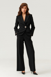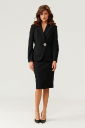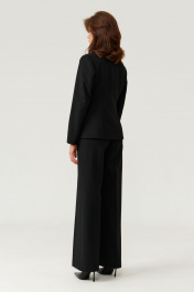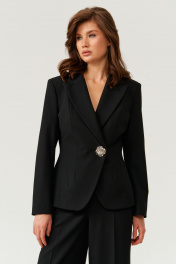 Женский жакет из поливискозной ткани, идеально подходящий для повседневной и деловой носки. Центральная застежка выполнена на одну обметанную петлю и одну металлическую декоративную пуговицу, что придает модели элегантный вид. Край борта оформлен фигурной линией, добавляющей изящества. Передняя часть украшена двумя рельефами, не доходящими до низа, и одним выходящим из бокового шва рельефом, создающим интересные объемы и линию силуэта. Спинка выполнена со средним швом и тремя рельефами, что обеспечивает хорошую посадку и стильный дизайн. Горловина обработана пиджачным воротником, а длинные втачные рукава дополняют образ. Жакет на подкладке, что обеспечивает комфорт и аккуратность посадки. Модель выполнена в классическом черном цвете, что делает ее универсальной для различных образов и ситуаций. 42 Жакет: Длина изделия по спинке - 63,5см, Длина рукава - 61см, Ширина плеча - 13,5см, Ширина по бедрам - 55см, Ширина по груди - 48см, Ширина по талии - 41см, Ширина рукава вверху - 18см, Ширина рукава внизу - 13,3см, Ширина спинки - 38см; 46 Жакет: Длина изделия по спинке - 63,5см, Длина рукава - 61см, Ширина плеча - 14см, Ширина по бедрам - 58см, Ширина по груди - 52см, Ширина по талии - 45см, Ширина рукава вверху - 20см, Ширина рукава внизу - 13,8см, Ширина спинки - 39см; 48 Жакет: Длина изделия по спинке - 64см, Длина рукава - 61см, Ширина плеча - 14,2см, Ширина по бедрам - 60см, Ширина по груди - 54см, Ширина по талии - 47см, Ширина рукава вверху - 21см, Ширина рукава внизу - 14см, Ширина спинки - 39,5см; 52 Жакет: Длина изделия по спинке - 64см, Длина рукава - 61см, Ширина плеча - 14,8см, Ширина по бедрам - 64см, Ширина по груди - 58см, Ширина по талии - 51см, Ширина рукава вверху - 22,5см, Ширина рукава внизу - 14,8см, Ширина спинки - 40,5см; 54 Жакет: ;