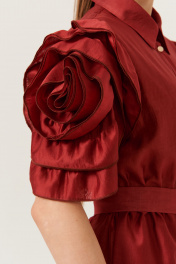 Это женское платье выполнено из мягкой и приятной на ощупь поливискозной ткани, идеально подходящей для повседневного и особого гардероба. Модель обладает длиной макси, создавая элегантный и женственный силуэт. Цвет — насыщенный терракотовый оттенок, придающий образу тепло и выразительность. Центральная застежка выполнена на обметанные петли и пуговицы, что обеспечивает надежность и стильный внешний вид. Платье отрезное по линии талии со сборкой, что создает аккуратную посадку и подчеркивает фигуру. В боковых швах расположены карманы, добавляющие функциональности и удобства. Горловина оформлена рубашечным воротником с отрезной стойкой, придавая образу классический и строгий стиль. Рукава втачные, украшены декоративной настрочной розой, которая добавляет изящности и оригинальности. Платье дополнено поясом, который можно завязать для подчеркнутой талии и завершенности образа. Это платье станет отличным выбором для повседневных прогулок, встреч или мероприятий, сочетая комфорт с элегантностью и стилем. 46 Платье: Длина изделия - 124см, Длина рукава - 30см, Ширина плеча - 12.7см, Ширина по бедрам - 67см, Ширина по груди - 54см, Ширина по талии - 40см, Ширина рукава - 20.3см;