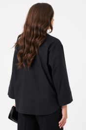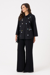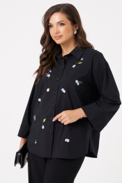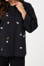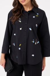 Это женская блузка чёрного оттенка из смесовой ткани с высоким содержанием хлопка, обеспечивающей комфорт и приятные тактильные ощущения. Модель выполнена с центральной бортовой застежкой, закрепленной на обметанных петлях и пуговицах, что придает ей классический и аккуратный вид. Перед украшен дизайнерской вышивкой в виде цветов, что добавляет изделию оригинальности и эстетической привлекательности. В боковых швах расположены небольшие разрезы, обеспечивающие свободу движений и удобство при носке. Горловина оформлена рубашечным воротником с отрезной стойкой, создавая структурированный и элегантный силуэт. Рукава втачные длинные, низ рукава обработан притачной манжетой, что делает дизайн завершенным и практичным. Эта блузка отлично подойдет для повседневных образов, сочетая комфорт, стиль и оригинальные декоративные элементы. 48 Блузка: Длина изделия - 68.5см, Длина рукава - 47.5см, Обхват шеи - 48см, Ширина плеча - 18см, Ширина по груди - 58.5см, Ширина по низу - 61.5см, Ширина рукава - 22.5см;