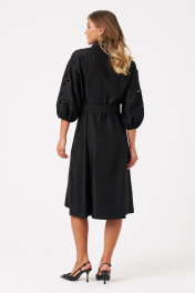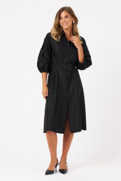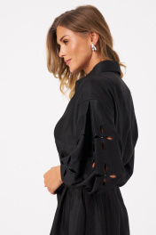 Это платье из смесовой ткани с высоким содержанием вискозы, выполненное в полуприлегающем силуэте. Модель с центральной застежкой на пуговицы с обметанными петлями. Передняя часть украшена двумя вертикальными рельефами, идущими от линии плеча до низа, что создает интересный визуальный эффект. Спинка также оформлена двумя вертикальными рельефами от плеча до линии низа. Талия подчеркнута шлёвками, позволяющими регулировать посадку или использовать пояс. Горловина оформлена рубашечным воротником с отрезной стойкой, придающей образу классический стиль. Рукава втачные, украшены красивым цветочным узором с перфорацией в виде лепестков, а нижняя часть рукава обработана притачной тесьмой со сборкой, добавляющей декоративности. Длина платья — миди, что делает его универсальным, за счет своего чёрного оттенка оно становиться элегантным и подходи для различных случаев. 44 Платье: Длина изделия по спинке - 110см, Длина рукава - 35см, Ширина плеча - 20см, Ширина по бедрам - 59см, Ширина по груди - 51см, Ширина по талии - 47см, Ширина рукава внизу - 15.5см;