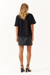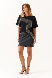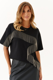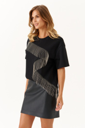 Это женский джемпер, выполненный из мягкого трикотажного полотна, идеально подходящего для повседневной носки. Модель отличается комфортной посадкой и стильным дизайном. Горловина чуть расширенная, что создает приятное ощущение свободы и легкости при ношении. Перед с фигурным швом, в который вставлена тесьма с цепью, которая переходит на рукав. Данный декор добавляет образу расслабленности и современного стиля. Линия плеча немного опущена. Рукава втачные длиной до уровня локтя. Этот джемпер чёрного цвета отлично подойдет для повседневных образов, сочетая уют и стиль. 42 Джемпер: ; 44 Джемпер: Длина изделия по спинке - 59см, Длина рукава - 19.5см, Ширина по груди - 54см, Ширина по низу - 52см, Ширина рукава - 19.5см; 46 Джемпер: Длина изделия по спинке - 59см, Длина рукава - 19.8см, Ширина по груди - 56см, Ширина по низу - 54см, Ширина рукава - 20см; 48 Джемпер: Длина изделия по спинке - 59см, Длина рукава - 20см, Ширина по груди - 58см, Ширина по низу - 56см, Ширина рукава - 21см; 50 Джемпер: Длина изделия по спинке - 59см, Длина рукава - 20.2см, Ширина по груди - 60см, Ширина по низу - 58см, Ширина рукава - 21.5см; 52 Джемпер: Длина изделия по спинке - 59см, Длина рукава - 20.4см, Ширина по груди - 62см, Ширина по низу - 60см, Ширина рукава - 22см; 54 Джемпер: Длина изделия по спинке - 59см, Длина рукава - 20.5см, Ширина по груди - 64см, Ширина по низу - 62см, Ширина рукава - 23см;