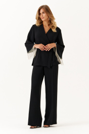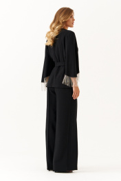 Жакет женский выполнен из лёгкой струящейся ткани, что обеспечивает комфорт и элегантность как для повседневной, так и для торжественной носки. Модель имеет запах, что подчёркивает женственность и делает силуэт более выразительным. Передняя часть жакета разделена по линии талии, что создаёт гармоничную посадку по фигуре. Верхняя часть переда украшена двумя талиевыми вытачками, ровно, как и нижняя часть, которая дополнительно подчёркивает приталенность изделия. Спинка со средним швом и двумя талиевыми вытачками обеспечивает удобство и хорошую посадку по спине. Горловина выполнена в V-образной форме, придавая образу изящность и удлинённость. Рукава втачные, длинные. Низ рукавов оформлен декоративной отделочной тесьмой с цепочкой, которая служит стильным акцентом и завершением модели. 44 Жакет: Длина изделия по спинке - 67см, Длина рукава - 48см, Ширина плеча - 13.3см, Ширина по груди - 50см, Ширина по низу - 57см, Ширина по талии - 43см, Ширина рукава вверху - 20см; 46 Жакет: Длина изделия по спинке - 67см, Длина рукава - 48см, Ширина плеча - 13.4см, Ширина по груди - 52см, Ширина по низу - 59см, Ширина по талии - 45см, Ширина рукава вверху - 20.5см; 48 Жакет: Длина изделия по спинке - 67см, Длина рукава - 48см, Ширина плеча - 13.5см, Ширина по груди - 54см, Ширина по низу - 61см, Ширина по талии - 47см, Ширина рукава вверху - 21.5см; 50 Жакет: Длина изделия по спинке - 67см, Длина рукава - 48см, Ширина плеча - 13.7см, Ширина по груди - 56см, Ширина по низу - 63см, Ширина по талии - 49см, Ширина рукава вверху - 22см; 52 Жакет: Длина изделия по спинке - 67см, Длина рукава - 48.5см, Ширина плеча - 13.9см, Ширина по груди - 58см, Ширина по низу - 65см, Ширина по талии - 50см, Ширина рукава вверху - 23см; 54 Жакет: Длина изделия по спинке - 67см, Длина рукава - 48.5см, Ширина плеча - 14см, Ширина по груди - 60см, Ширина по низу - 67см, Ширина по талии - 52см, Ширина рукава вверху - 24см; 56 Жакет: Длина изделия по спинке - 67см, Длина рукава - 48.5см, Ширина плеча - 14.1см, Ширина по груди - 62см, Ширина по низу - 69см, Ширина по талии - 54см, Ширина рукава вверху - 24.5см;