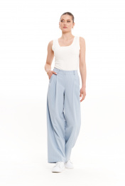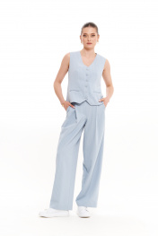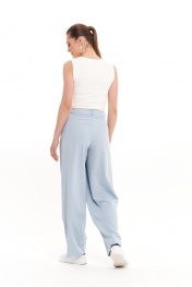 Женские брюки прямого кроя из смесовой ткани – универсальный базовый элемент гардероба для повседневной, офисной и нарядной носки. Эти классические брюки идеально подходят для весеннего и летнего сезона, сочетая комфорт и элегантность. Свободный крой и продуманный дизайн делают их отличным выбором для делового стиля или праздничного образа. Верхний срез обработан притачным поясом, застегивающимся на крючок и тесьму-молнию в среднем шве, что обеспечивает удобную посадку. Наличие шлёвок позволяет носить брюки с ремнем, добавляя стильности. Передняя часть украшена двумя складками, а задняя – талиевыми вытачками, подчеркивающими женственный силуэт. Голубой оттенок делает эти женские брюки идеальным вариантом для создания гармоничных ансамблей. Их можно комбинировать с базовыми рубашками, блузами или пиджаками для офисного лука или сочетать с нарядными топами для праздничных мероприятий. Свободный крой обеспечивает комфорт в повседневной носке, а классический дизайн делает их уместными в любых ситуациях. Эти брюки – must-have для современной женщины, ценящей стиль, удобство и универсальность. 44 Брюки: Высота посадки - 27.5см, Длина брюк с поясом - 108см, Длина по внутреннему шву - 80см, Ширина брючин сверху - 76см, Обхват брюк по низу - 56см, Ширина по бедрам - 57см, Ширина по талии - 36см; 46 Брюки: Высота посадки - 28см, Длина брюк с поясом - 108см, Длина по внутреннему шву - 80см, Ширина брючин сверху - 78см, Обхват брюк по низу - 57см, Ширина по бедрам - 59см, Ширина по талии - 38см; 50 Брюки: Высота посадки - 29см, Длина брюк с поясом - 108см, Длина по внутреннему шву - 80см, Ширина брючин сверху - 82см, Обхват брюк по низу - 59см, Ширина по бедрам - 63см, Ширина по талии - 44см;