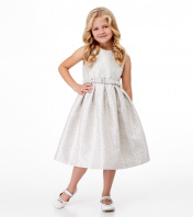 Нарядное детское платье из жаккардовой ткани с изящным блеском. Платье отрезное по талии, с круглым вырезом горловины, без рукавов, с застежкой на потайную тесьму-молнию по спинке. Юбка платья объёмная с глубокими складками по переду и по спинке. Платье дополнено съёмным поясом на резинке с большим бантом. Платье на хлопковой подкладки. 30 Платье: Длина изделия от высшей плечевой точки до низа - 76см, Ширина плеча - 6.5см, Ширина по груди - 33см, Ширина по подрезу - 32см; 30 Платье: Длина изделия от высшей плечевой точки до низа - 79см, Ширина плеча - 7см, Ширина по груди - 33см, Ширина по подрезу - 32см; 32 Платье: Длина изделия от высшей плечевой точки до низа - 82см, Ширина плеча - 7.5см, Ширина по груди - 35см, Ширина по подрезу - 34см;