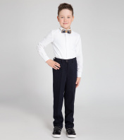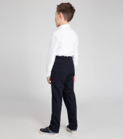 Классические брюки для мальчика из поливискозного трикотажного полотна. Брюки на талии, по поясу распологается перфорированная резинка, которая позволяет регулировать прилегание по талии. Брюки прямого силуэта с притачным поясом. Брюки с застежкой на одну петлю и пуговицу на поясе и тесьму-молнию по переду. По поясу расположены шлевки. На передних частях расположены боковые карманы. На задних частях брюк обработаны по одной вытачке на каждой половине. На задних частях брюк имеется прорезной карман в рамку. 30 34 36