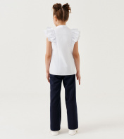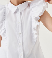 Нарядная блузка для девочки из хлопковой ткани. Блузка с центральной сквозной застежкой на петли и пуговицы. Воротник сорочечный на отрезной стойки. Блузка без рукавов. По переду и по спинки имеются рельефные швы. Блузка дополнена объёмными рюшами, которые придают нарядность блузки. Отличный нарядный вариант для школьных дней. 30 Блузка: Длина изделия - 45см, Обхват шеи - 37см, Ширина плеча - 13.5см, Ширина по груди - 34см, Ширина по низу - 37см; 30 Блузка: Длина изделия - 47см, Обхват шеи - 37см, Ширина плеча - 14см, Ширина по груди - 34см, Ширина по низу - 37см; 34 Блузка: Длина изделия - 53см, Обхват шеи - 38см, Ширина плеча - 15см, Ширина по груди - 38см, Ширина по низу - 41см;