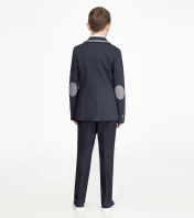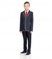 Строгий пиджак для мальчика из трикотажного полотна на вискозной подкладки. Пиджак полуприлегающего силуэта, удлиненный, с центральной застежкой на две петли и пуговицы до перегиба лацкана.Детали переда с отрезными бочками, передними вытачками и боковыми прорезными карманами в рамку. На левой детали переда верхний прорезной карман с листочкой. Спинка со средним швом, заканчивающимся шлицей. Рукава втачные двухшовные, локтевые швы заканчиваются шлицами. На шлицах по четыре отделочные петли и пуговицы. Воротник пиджачного типа с тупыми концами. Пиджак с притачной по низу подкладкой. На деталях подкладки обработан внутренний карман и вешалка. Край воротника, лацкана, борта обработан притачным кантом. 30 Пиджак: Длина изделия - 42см, Длина рукава - 41.5см, Ширина плеча - 8.5см, Ширина по груди - 34см, Ширина по низу - 35см, Ширина рукава - 13см; 32 Пиджак: Длина изделия - 51см, Длина рукава - 49см, Ширина плеча - 10см, Ширина по груди - 36см, Ширина по низу - 37см, Ширина рукава - 13.5см; 34 Пиджак: Длина изделия - 51см, Длина рукава - 49см, Ширина плеча - 10см, Ширина по груди - 38см, Ширина по низу - 39см, Ширина рукава - 14см; 34 Пиджак: Длина изделия - 54см, Длина рукава - 51.5см, Ширина плеча - 10.5см, Ширина по груди - 38см, Ширина по низу - 39см, Ширина рукава - 14см; 36 Пиджак: Длина изделия - 57см, Длина рукава - 54см, Ширина плеча - 11см, Ширина по груди - 40см, Ширина по низу - 41см, Ширина рукава - 14.5см;