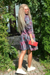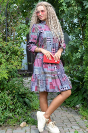 Милая модель прямого кроя из гладкого текстиля с классическим принтом. Особую женственность данному платью придают пышные рукава, собранные снизу на резинку, каскадные воланы, продолжающие слегка удлиненный лиф, и V-образный вырез со стойкой. Платье не имеет застежки и карманов