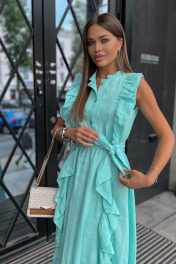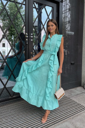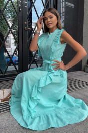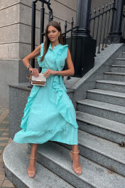 Льняное платье с воланами: самая романтичная Модель лета! Стильное, невероятно эффектное платье. Застегивается на пуговицы. Воздушность и легкость платью придают вертикальные воланы, что, к тому же, вытягивает силуэт. Низ платья, так же, декорирован воланом, придающим романтичности и особого шика. Элегантное, женственное, мгновенно приковывает взгляд к обладательнице – такое платье подойдет как для романтических прогулок, встреч с друзьями, так и для особых событий в вашей жизни, даря прекрасное настроение и возможность выглядеть на все 100%. Пояс в комплект с платьем