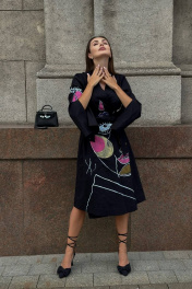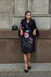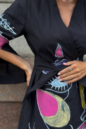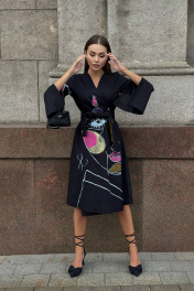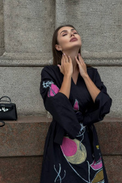 Платье-кимоно – поистине уникальный элемент гардероба, позволяющий создавать неповторимые образы на все случаи жизни. Натуральные ткани, свободный крой и строгая простота фасона делают любую женщину в таком наряде утонченной и загадочной. Благодаря свободному крою и уникальной возможности скрывать любые недостатки, выгодно подчеркивая достоинства, платье-кимоно идеально смотрится абсолютно на любой фигуре. Кимоно — это про свободу, комфорт и красоту. Вам не нужно переживать о трендах, соблюдать какие-то особые правила, вписываться в стандарты, искать крутые бренды и т.д. Руководствуйтесь в выборе своими ощущениями. Вам нравится цвет и ткань? Супер! Хорошо сидит? Отлично, берем! Платье-кимоно с ручной росписью. Длина миди.