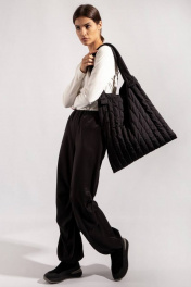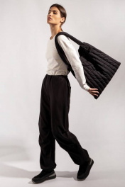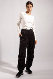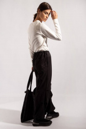 Брюки-карго оверсайз прямого силуэта из вискозной бархатистой ткани с кулисой (резинка) по талии и по низу. Ширина брюк и уровень посадки по талии регулируется степенью приталенности кулисы. На уровне колена декоративные защипы. В боковых швах брюк обработаны карманы. Сзади также есть накладные карманы.