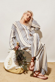 Рубашка женская из мягкого льна в бежево\синюю\голубую полоску свободного силуэта, удлиненная, с боковыми разрезами по низу. Горловина V-образной формы с притачной планкой, застегивающаяся на 5 пуговиц. Рукава широкие длинные с высокой подгибкой.