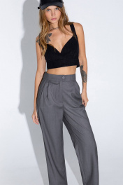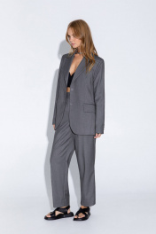 Текстильный костюм-двойка из свободного жакета со шлицами и брюк со складками Детали: жакет полуприлегающего силуэта, талиевые вытачки, пиджачный воротник, застежка на две петли и пуговицы, функциональные карманы, рукава и спинка со шлицами, жакет на подкладке из 100% вискозы. Брюки с высокой посадкой, притачной пояс со шлевками, задняя часть пояса эластичная- с резинкой, застежка на молнию и пуговицу, боковые карманы, передние половины с двумя складками Длина жакета по спинке около 70 см в размерах 40-46 и около 73 см в размерах 48-52 Длина рукавов около 63 см Длина брюк по боковому шву с поясом около 99,5 см в размерах 40-46 и около 101 см в размерах 48-52, длина по внутреннему шву около 70 см