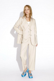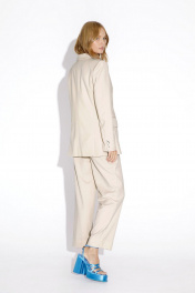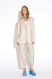 Текстильный костюм-двойка из свободного жакета со шлицами и брюк со складками Детали: жакет полуприлегающего силуэта, талиевые вытачки, пиджачный воротник, застежка на две петли и пуговицы, функциональные карманы, рукава и спинка со шлицами, жакет на подкладке из 100% вискозы. Брюки с высокой посадкой, притачной пояс со шлевками, задняя часть пояса эластичная- с резинкой, застежка на молнию и пуговицу, боковые карманы, передние половины с двумя складками Длина жакета по спинке около 70 см в размерах 40-46 и около 73 см в размерах 48-52 Длина рукавов около 63 см Длина брюк по боковому шву с поясом около 99,5 см в размерах 40-46 и около 101 см в размерах 48-52, длина по внутреннему шву около 70 см