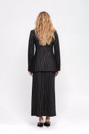 Костюм-двойка из приталенного жакета и макси-юбки из текстильной ткани в полоску Детали: жакет полуприлегающего силуэта, рельефные швы, пиджачный воротник, функциональные карманы, втачные длинные рукава, двубортная застежка на петли и пуговицы, спинка со шлицей, жакет на подкладке. Юбка с высокой посадкой на притачном поясе со шлевками, застежка на молнию и пуговицу, боковые карманы, высокий фигурный разрез Длина жакета по спинке около 70/73 см, длина рукавов около 62 см; Длина юбки по боковому шву с поясом около 98 см