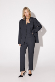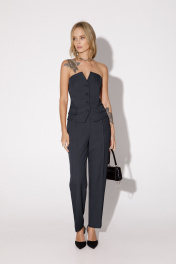 Текстильный костюм-двойка из топа-корсета и укороченных брюк со стрелками. Детали: топ-корсет прилегающего силуэта, рельефные швы с регилином, функциональные карманы, застежка по переду на петли и пуговицы, спинка с эластичной вставкой, фигурный низ. Брюки с высокой посадкой на притачном поясе со шлевками, передние половины с небольшими застроченными мягкими складками и заутюженными стрелками, застежка на молнию и пуговицу, боковые карманы. Длина топа по спинке около 27,5 см в размерах 40-46 и около 29 см в размерах 48-52. Длина брюк по боковому шву с поясом около 99/100,5 см, длина по внутреннему шву около 69,5 см.