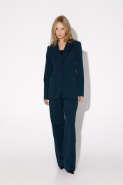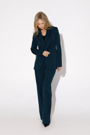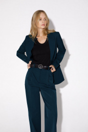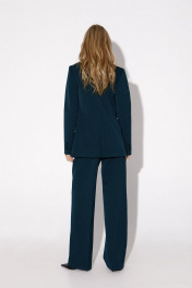 Костюм-двойка из полуприлегающего жакета со шлицами и широких брюк. Детали: пиджачный воротник, талиевые вытачки, перед с функциональным нагрудным карманом и двумя прорезными карманами, застежка на пуговицы, спинка со средним швом и шлицей, рукава втачные двухшовные со шлицами по низу, жакет на подкладке. Брюки с высокой посадкой на притачном поясе со шлевками, передние половины с небольшими застроченными мягкими складками и заутюженными стрелками, застежка на молнию и пуговицу, боковые карманы. Длина жакета по спинке около 69 см в размерах 40-46 и около 72 см в размерах 48-52, длина рукава около 61см. Длина брюк по боковому шву с поясом около 113 см в размерах 40-46 и около 114,5 см в размерах 48-52.