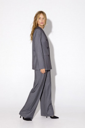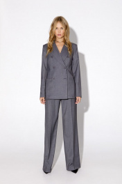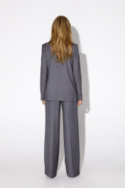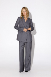 Текстильный костюм-двойка из классического двубортного жакета и прямых брюк-палаццо со стрелками. Детали: жакет полуприлегающего силуэта, пиджачный воротник, перед с прорезными карманами, двубортная застежка на петли и пуговицы, спинка со средним швом, рукава втачные двухшовные, жакет на подкладке. Брюки с высокой посадкой на притачном поясе со шлевками, застежка на молнию и пуговицу, боковые карманы, передние половины с заутюженными стрелками и двумя небольшими складками. Длина жакета по спинке около 66 см в размерах 40-46 и около 69 см в размерах 48-52, длина рукавов около 61 см. Длина брюк по боковому шву с поясом около 113 см в размерах 40-46 и около 114,5 см в размерах 48-52, длина по внутреннему шву около 82 см.