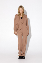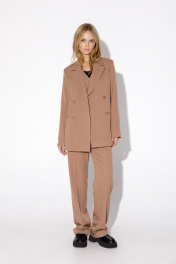 Текстильный костюм-тройка из двубортного оверсайз жакета, полуприлегающего жилета и прямых брюк с высокой посадкой. Детали: жакет прямого силуэта, пиджачный воротник, прорезные карманы, спинка со средним швом, втачные двухшовные рукава, жакет на подкладке. Жилет с талиевыми вытачками, застежка на петли и пуговицы, функциональные карманы, фигурный низ, на подкладке. Брюки на притачном поясе со шлевками, передние половины с небольшими мягкими складками и заутюженными стрелками, застежка на молнию и пуговицу, боковые карманы. Длина жакета по спинке около 70 см в размерах 40-46 и около 73 см в размерах 48-52, длина рукавов около 62 см. Длина жилета по спинке около 48,5/51,5 см. Длина брюк по боковому шву с поясом около 112,5 в размерах 40-46 и около 114 см в размерах 48-52, длина по внутреннему шву около 80 см.