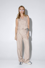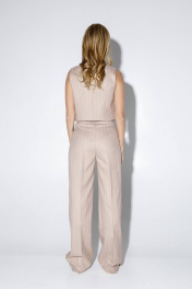 Текстильный костюм-тройка из оверсайз жакета, укороченного жилета и прямых брюк-палаццо со стрелками. Детали: жакет прямого силуэта, расширенная линия плеч, пиджачный воротник, перед с прорезными функциональными карманами, однобортная застежка на петли и пуговицы, спинка со средним швом и шлицей, рукава втачные двухшовные, жакет на подкладке. Жилет прямого силуэта с фигурным низом, талиевые вытачки, застежка на петли и пуговицы, функциональные карманы, на подкладке. Брюки с высокой посадкой на притачном поясе со шлевками, застежка на молнию и пуговицу, боковые карманы, передние половины с заутюженными стрелками и двумя небольшими складками. Длина жакета по спинке около 69 см в размерах 40-46 и около 72 см в размерах 48-52, длина рукавов около 62 см. Длина жилета по спинке около 39 см в размерах 40-46 и около 43 см в размерах 48-52. Длина брюк по боковому шву с поясом около 113 см в размерах 40-46 и около 114,5 см в размерах 48-52, длина по внутреннему шву около 82 см.