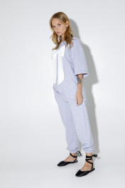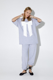 Трикотажный костюм-двойка из свободного джемпера с бантом и брюк-джоггеров. Детали: джемпер прямого силуэта, спущенная линия плеча, круглая горловина переда и спинки, кокетка переда, рукава короткие, без застежки, джемпер из трикотажа футер-трехнитка. Брюки с высокой посадкой на эластичном поясе, карманы в боковых швах, низ брюк на резинке. Длина джемпера по спинке около 72 см в размерах 40-46 и около 75 см в размерах 48-52 см, длина рукава+ плечо около 26+11 см. Длина брюк с поясом около 103 см в размерах 40-46 и около 104,5 см в размерах 48-52 см.