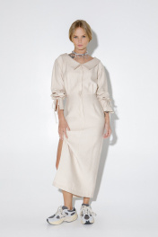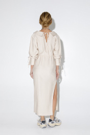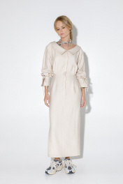 Текстильное платье длины макси с акцентным воротником и высоким разрезом. Детали: полуприлегающий силуэт, спущенная линия плеча, завышенная линия талии с резинкой по спинке, перед с потайной планкой-застежкой на петли и пуговицы, глубокий V-образный вырез спинки, рукава длинные с фигурными манжетами и застежкой-завязками, платье без подкладки. Длина юбки по боковому шву около 93 см, длина рукавов+ плечо около 58 см+ 3 см