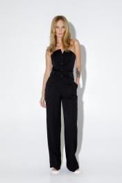 Текстильный костюм-тройка из приталенного жакета свободного покроя с разрезами по рукавам, топа-корсета и прямых брюк-палаццо со стрелками. Детали: жакет прилегающего силуэта, пиджачный воротник, рельефные швы, перед с прорезными карманами, застежка на петли и пуговицы, спинка со средним швом, рукава втачные двухшовные с высоким разрезом по низу рукавов, жакет на подкладке. Топ-корсет прилегающего силуэта, рельефные швы с регилином, функциональные карманы, застежка по переду на петли и пуговицы, спинка с эластичной вставкой, фигурный низ. Брюки с высокой посадкой на притачном поясе со шлевками, пояс прямой без резинки, застежка на молнию и пуговицу, боковые карманы, передние половины с заутюженными стрелками и двумя небольшими складками. Задние части брюк с вытачками и заутюженными стрелками. Длина жакета по спинке около 64 см в размерах 40-46 и около 67 см в размерах 48-50, длина рукавов около 64 см. Длина топа по спинке около 27,5 см в размерах 40-46 и около 29 см в размерах 48-52. Длина брюк по боковому шву с поясом около 113 см в размерах 40-46 и около 114,5 см в размерах 48-52, длина по внутреннему шву около 82 см.