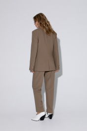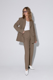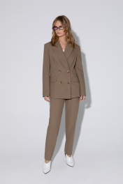 Костюм-двойка из свободного двубортного жакета и классических-брюк из текстильной ткани. Детали: жакет свободного покроя и полуприлегающего силуэта, двубортная застежка на петли и пуговицы, отрезные бочки, пиджачный воротник, функциональные карманы, жакет на подкладке. Брюки на притачном поясе со шлевками, застежка на молнию и пуговицу, боковые карманы, передние половины заутюженными стрелками. Задние части брюк с вытачками, стрелками и имитацией карманов. Низ брюк с широкой подгибкой, при помощи подгибки можно регулировать длину, подвернув её. Длина жакета по спинке около 69 см в размерах 40-46 и около 72 см в размерах 48-52, длина рукавов около 62 см. Длина брюк по боковому шву с поясом около 101,5 см, длина по внутреннему шву около 74 см