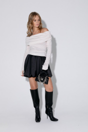 Атласная юбка-баллон длины мини. Детали: юбка с высокой посадкой на широком притачном поясе без резинки, рельефные швы, потайная застежка-молния по спинке, на подкладке Длина с поясом около 45 см в размерах 40-46 и около 47 см в размерах 48-52