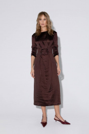 Текстильное миди-платье со шнуровкой. Детали: приталенный силуэт, перед со средним швом и регулируемой шнуровкой, рукава втачные длинные, спинка с талиевыми вытачками, потайная застежка в среднем шве спинки, платье без подкладки. Длина по спинке около 117 см, длина рукава около 59 см