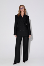 Текстильный костюм-двойка из свободного жакета и прямых брюк со стрелками. Детали: жакет свободного покроя и полуприлегающего силуэта, двубортная застежка на петли и пуговицы, отрезные бочки, пиджачный воротник, функциональные карманы, жакет на подкладке. Брюки с высокой посадкой, притачной пояс со шлевками, передние половины с небольшими застроченными мягкими складками и заутюженными стрелками, застежка на молнию и пуговицу, боковые карманы. Задние части брюк с вытачками и заутюженными стрелками. Пояс брюк прямой, без резинки. Длина жакета по спинке около 69 см в размерах 40-46 и около 72 см в размерах 48-52, длина рукавов около 62 см. Длина брюк по боковому шву с поясом около 114 в размерах 40-46 и около 115,5 см в размерах 48-52. Длина по внутреннему шву около 83 см
