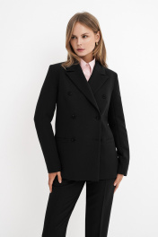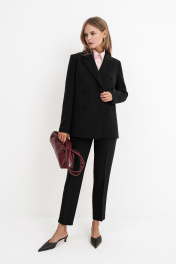 Текстильный костюм-тройка из двубортного жакета, полуприлегающего жилета и укороченных брюк со средней посадкой. Детали: жакет прямого силуэта, пиджачный воротник, перед с прорезными карманами, застежка на петли и пуговицы, спинка со средним швом, рукава втачные двухшовные, жакет на подкладке. Жилет полуприлегающего силуэта с фигурным низом, застежка на петли и пуговицы, на подкладке. Брюки на притачном поясе со шлевками, передние половины с небольшими мягкими складками и заутюженными стрелками, застежка на молнию и пуговицу, боковые карманы. Длина жакета по спинке около 66 см в размерах 40-46 и около 69 см в размерах 48-52, длина рукава около 61 см. Длина жилета по спинке около 48,5 см в размерах 40-46 и около 51,5 см в размерах 48-52. Длина брюк по боковому шву с поясом около 93,5 см в размерах 40-46 и около 95 см в размерах 48-52. Длина по внутреннему шву около 66 см.