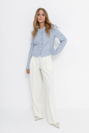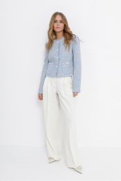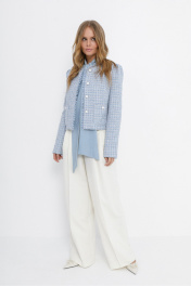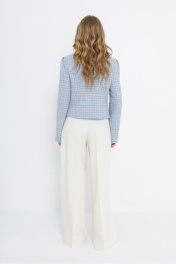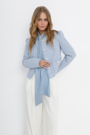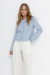 Укороченный жакет из фактурной ткани в стиле «шанель». Детали: полуприлегающий силуэт, рельефы, круглая горловина, без воротника, рукава втачные со складками по окату, функциональные карманы, застежка на петли и пуговицы, на подкладке. Длина по спинке около 48 см в размерах 40-46 и около 51 см в размерах 48-52, длина рукава около 65 см