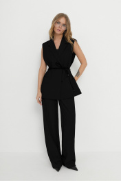Костюм-двойка из прямого жилета и широких брюк со стрелками. Детали: жилет прямого силуэта, талиевые вытачки переда и спинки, пиджачный воротник, застежка на пришивные кнопки, спинка со средним швом и шлицей, функциональные карманы, жилет на подкладке, в комплекте пояс из основной ткани и чёрный пояс-шнурок из кожзама. Брюки с высокой посадкой, притачной пояс со шлевками, передние половины с небольшими застроченными мягкими складками и заутюженными стрелками, застежка на молнию и пуговицу, боковые карманы. Задние части брюк с вытачками и заутюженными стрелками. Пояс брюк прямой, без резинки. Длина жилета по спинке около 69 см в размерах 40-46 и около 71 см в размерах 48-52. Длина брюк по боковому шву с поясом около 114 в размерах 40-46 и около 115,5 см в размерах 48-52. Длина по внутреннему шву около 83 см