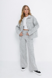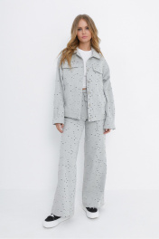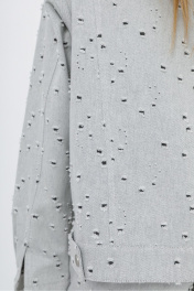 Свободная куртка-рубашка из хлопкового джинса с перфорацией. Детали: прямой силуэт, спущенная линия плеча, кокетки переда и спинки, рельефные швы, функциональные карманы, застежка на петли и металлические пуговицы, рукава длинные с притачными манжетами. Длина куртки спинке около 58 см в размерах 40-46 и около 60,5 см в размерах 48-52, длина рукава+ плечо около 54+7 см