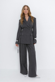 Жакет со шнуровкой из текстильной ткани с рисунком «ёлочка». Детали: жакет полуприлегающего силуэта, расширенные плечи, рельефы, пиджачный воротник, застежка на две петли и пуговицы, функциональные карманы, жакет на подкладке. Жакет также можно зашнуровать по бокам. Длина по спинке около 69 в размерах 40-46 и около 72 см в размерах 48-52, длина рукавов около 61 см